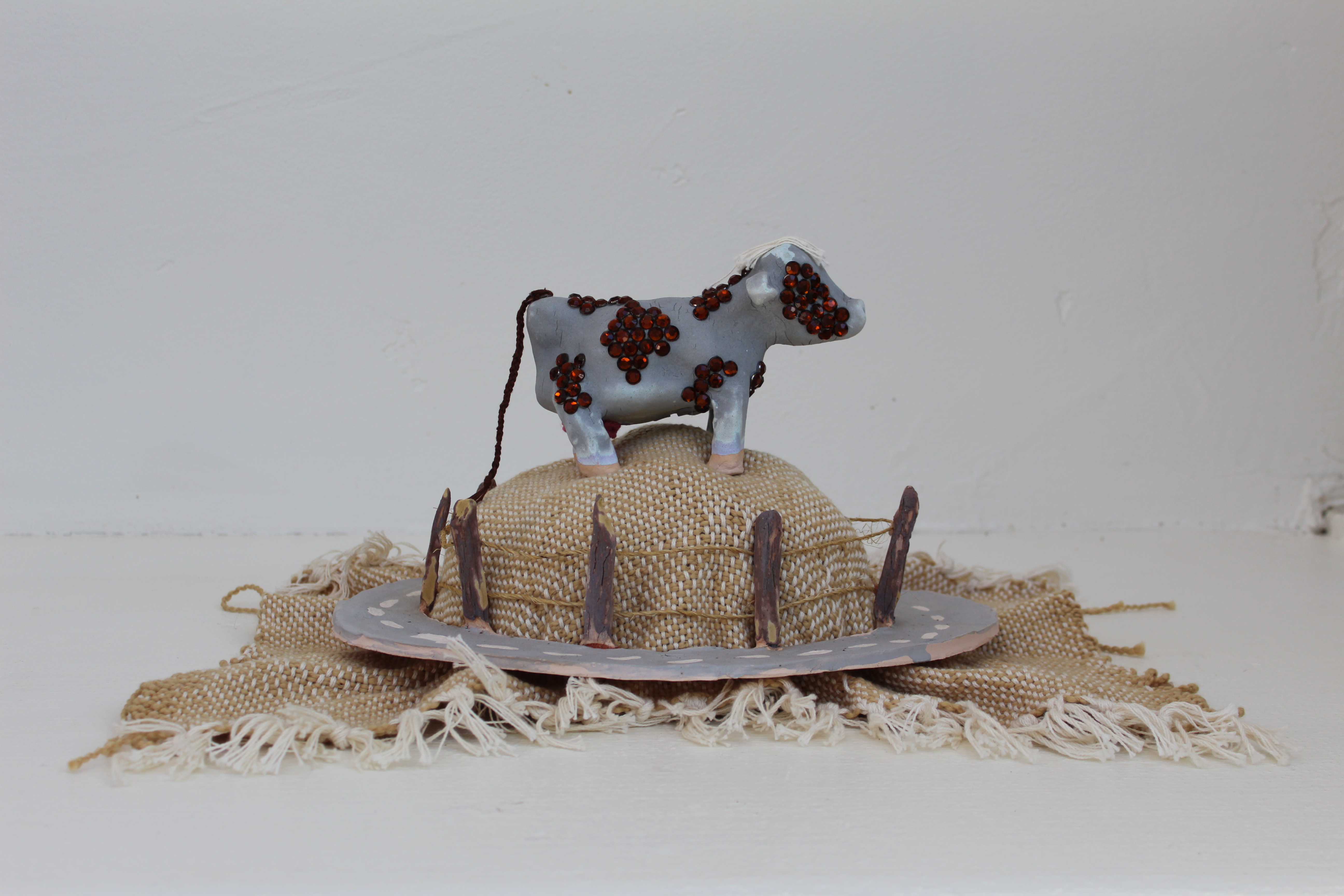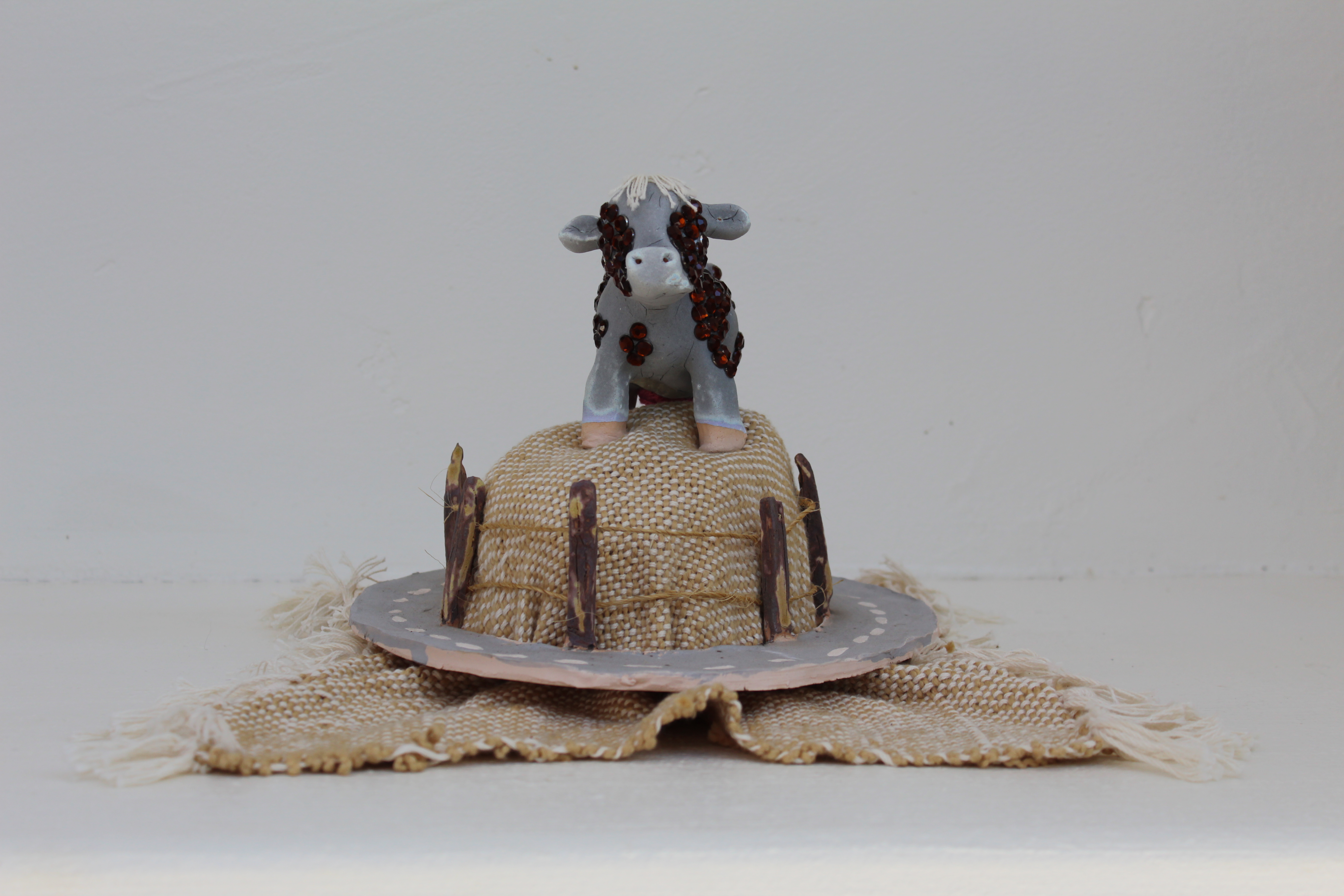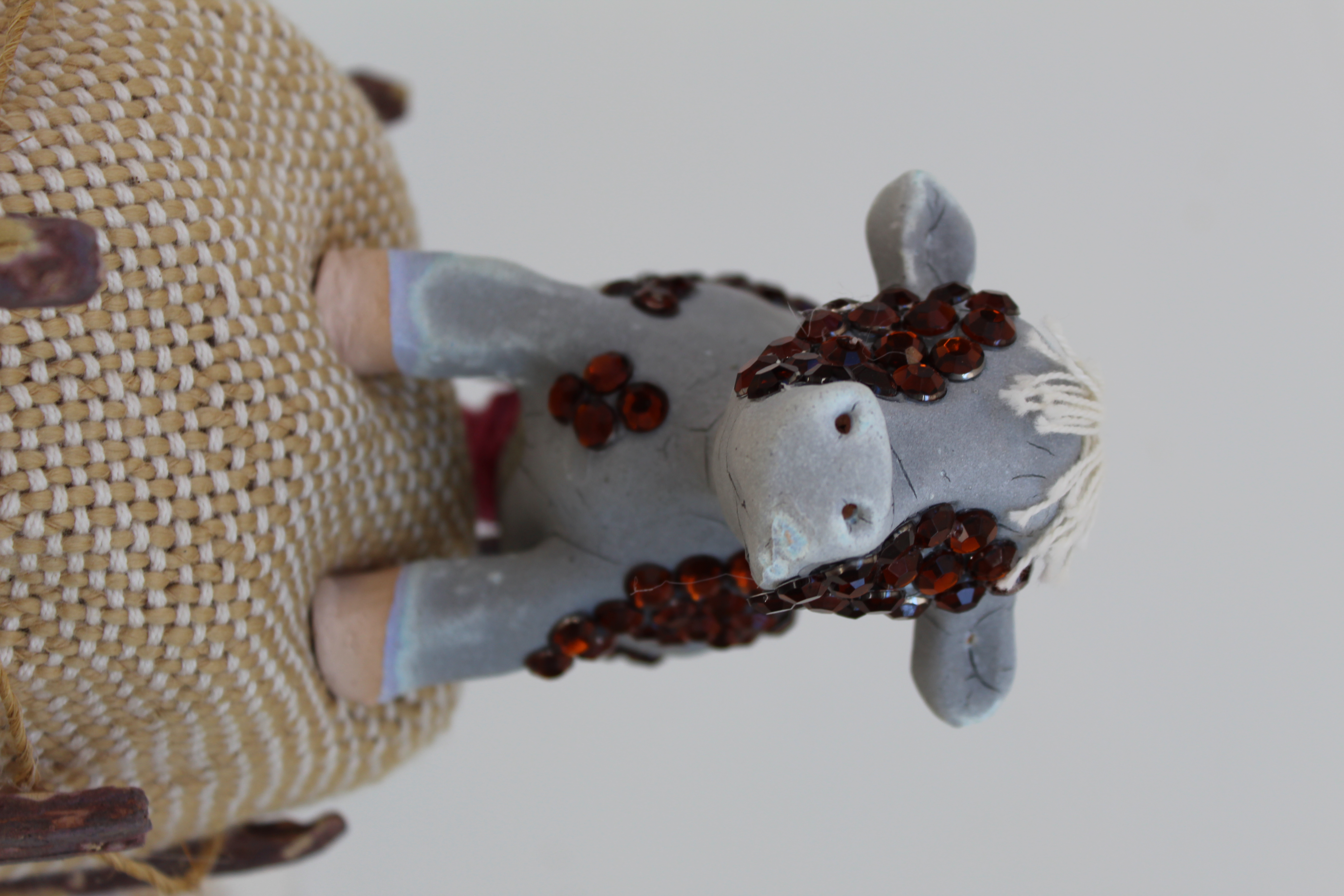 High Fire Glaze on Stoneware, Yarn, Twine, and Rhinestones